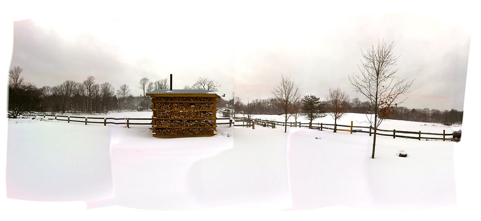 Next they developed an ingenious framework suitable to both uses. One end, the walls are made by inserting hay bails to feed the animals and, on the other, firewood to feed the maple sap evaporator. Simple and efficient!